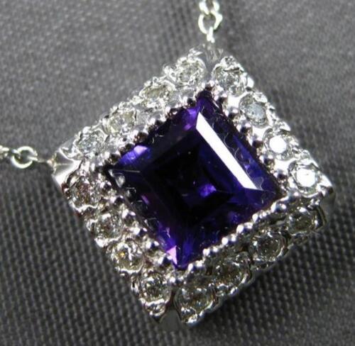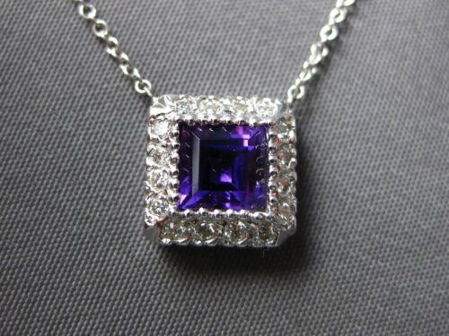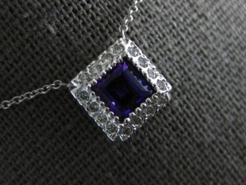 14KT WHITE GOLD LOVE NECKLACE. 3D CLASSIC SQUARE HALO DESIGN. ROUND DIAMONDS ARE F/G COLOR, VSSI CLARITY .20 CARATS. AAA PRINCESS CUT AMETHYST IS .50 CARATS. MEASURES 9mm WIDE. 16" INCHES LONG. WRITTEN APPRAISAL AVAILABLE. COMES IN A PRESENTABLE GIFT BOX.