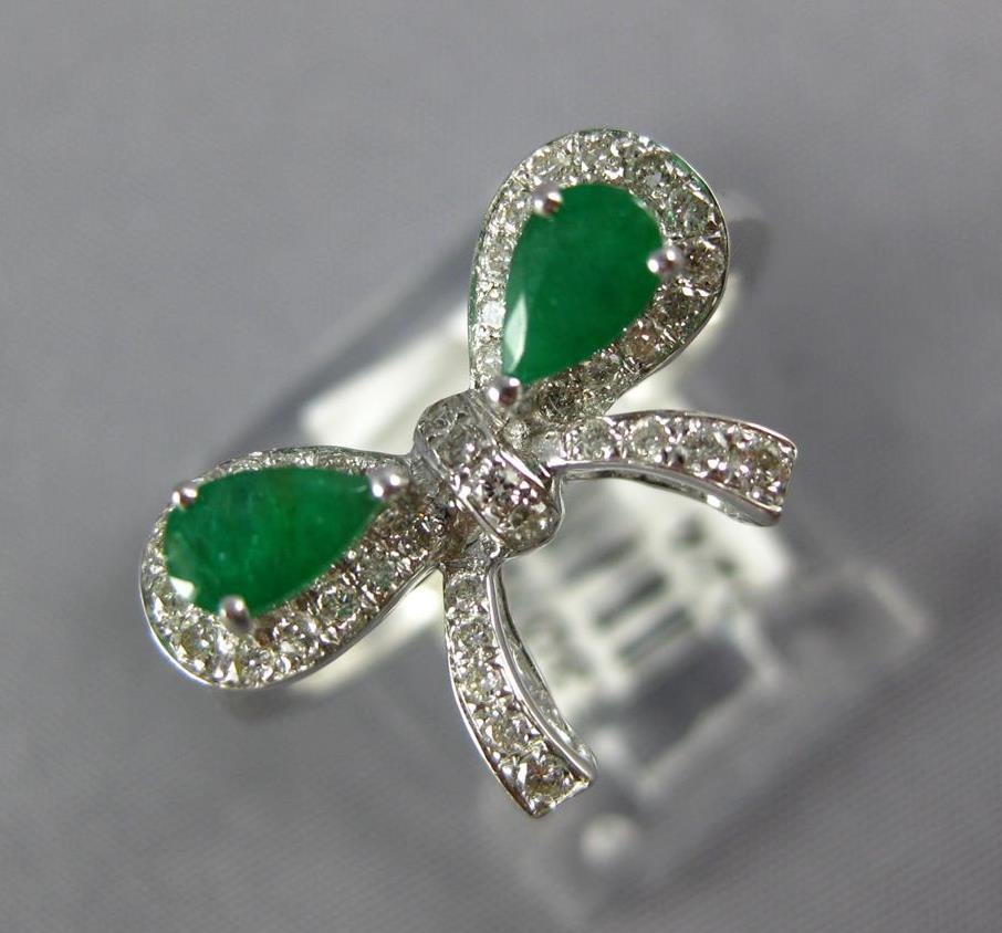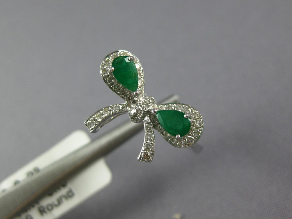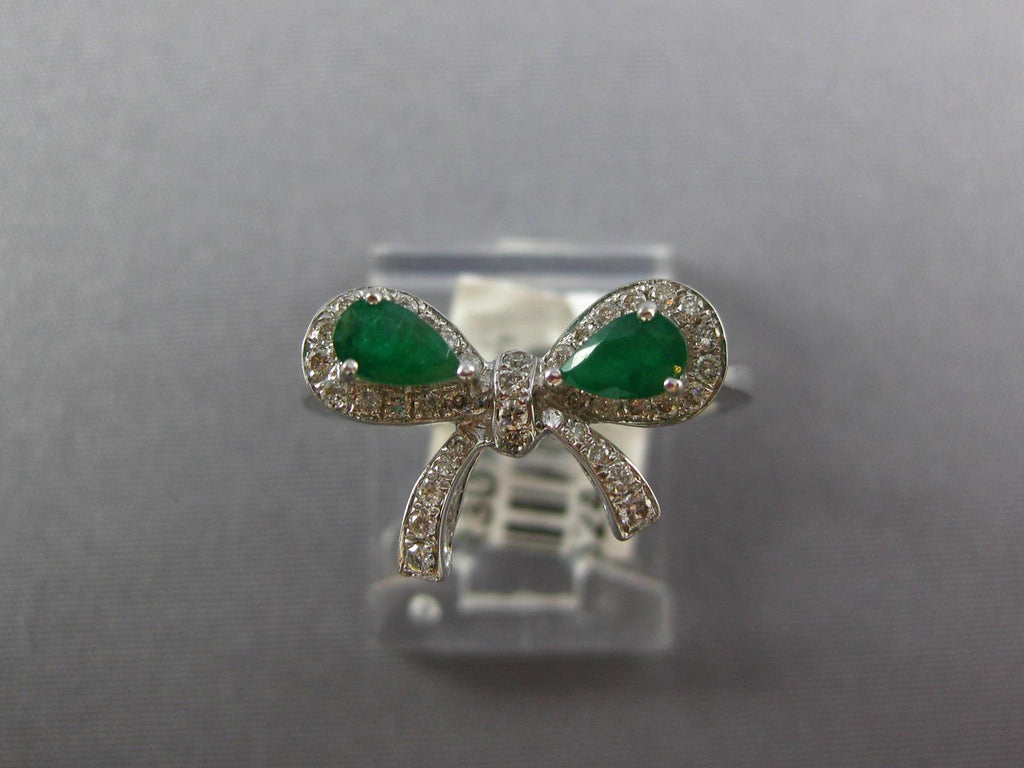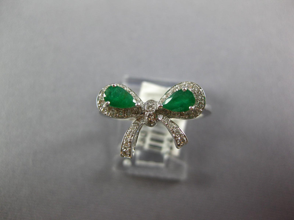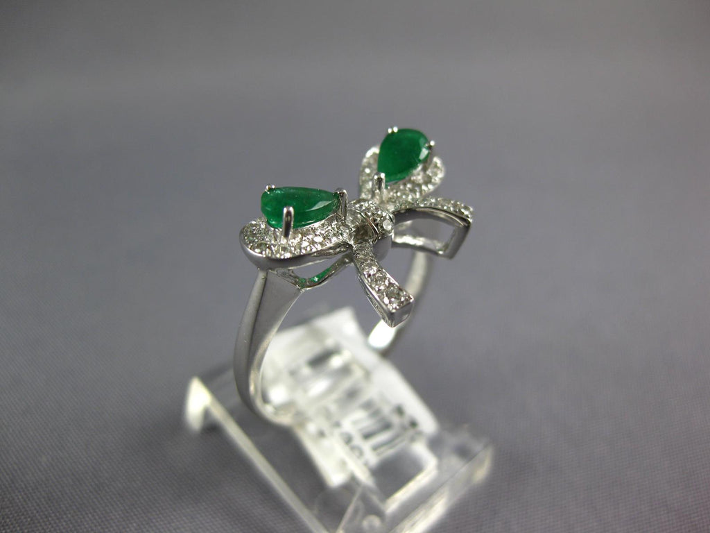 14KT WHITE GOLD FUN RING. 3D CLASSIC BOW SHAPE DESIGN. ROUND DIAMONDS ARE F/G COLOR, VSSI CLARITY .23 CARATS. AAA PEAR SHAPE EMERALDS ARE .48 CARATS. MEASURES 10mm WIDE. RING SIZE 7. CAN BE SIZED BY OUR MASTER JEWELER UPON REQUEST. WRITTEN APPRAISAL AVAILABLE. COMES IN A PRESENTABLE GIFT BOX.