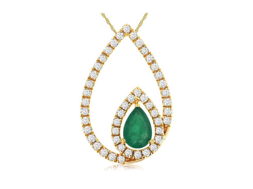 14KT YELLOW GOLD FLOATING PENDANT. 3D DOUBLE TEAR DROP DESIGN. ROUND DIAMONDS ARE F/G COLOR, VSSI CLARITY .33 CARATS. AAA PEAR SHAPE EMERALD IS .38 CARATS. COMES ON A 14KT GOLD DIAMOND CUT 18" INCH CHAIN. WRITTEN APPRAISAL AVAILABLE. COMES IN A PRESENTABLE GIFT BOX.