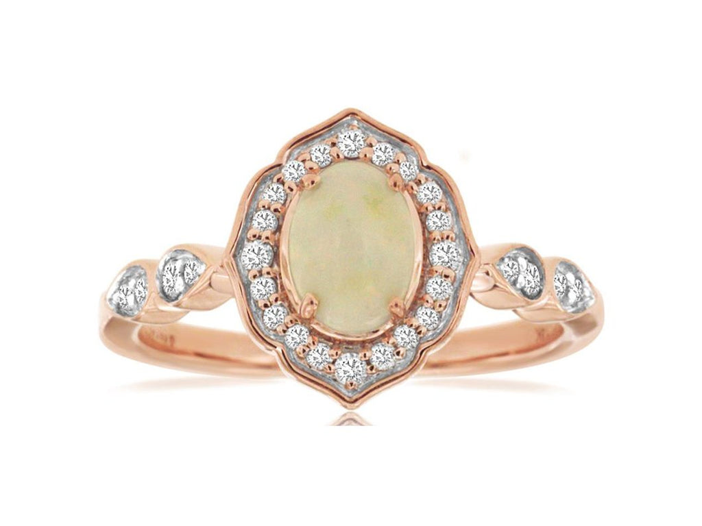 14KT ROSE GOLD FUN RING. 3D FLOWER FILIGREE DESIGN. ROUND DIAMONDS ARE F/G COLOR, VSSI CLARITY .21 CARATS. AAA OVAL OPAL IS .50 CARATS. RING SIZE 7. CAN BE SIZED BY OUR MASTER JEWELER UPON REQUEST. WRITTEN APPRAISAL AVAILABLE. COMES IN A PRESENTABLE GIFT BOX.