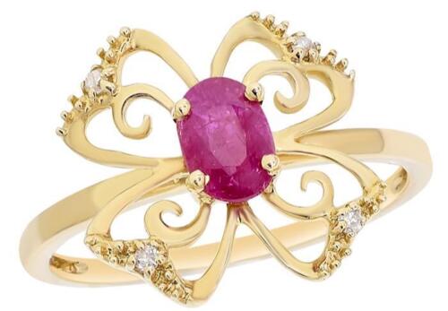 14KT YELLOW GOLD LOVE RING. 3D CLASSIC FLOWER DESIGN. ROUND DIAMONDS ARE F/G COLOR, VSSI CLARITY .04 CARATS. AAA OVAL RUBY IS .67 CARATS. RING SIZE 7. CAN BE SIZED BY OUR MASTER JEWELER UPON REQUEST. WRITTEN APPRAISAL AVAILABLE. COMES IN A PRESENTABLE GIFT BOX.