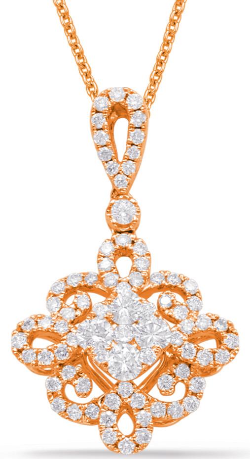 14KT ROSE GOLD LOVE PENDANT. 3D INVISIBLE OPEN FILIGREE FLOWER DESIGN. ROUND DIAMONDS ARE F/G COLOR, VSSI CLARITY .72 CARATS. MEASURES 15mm WIDE. COMES ON A 14KT GOLD DIAMOND CUT 16" INCH CHAIN. WRITTEN APPRAISAL AVAILABLE. COMES IN A PRESENTABLE GIFT BOX.