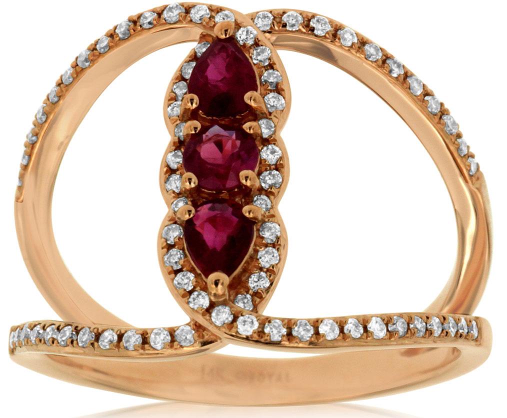 .72CT DIAMOND & AAA RUBY 14K ROSE GOLD PEAR SHAPE & ROUND 3 STONE LOVE KNOT RING