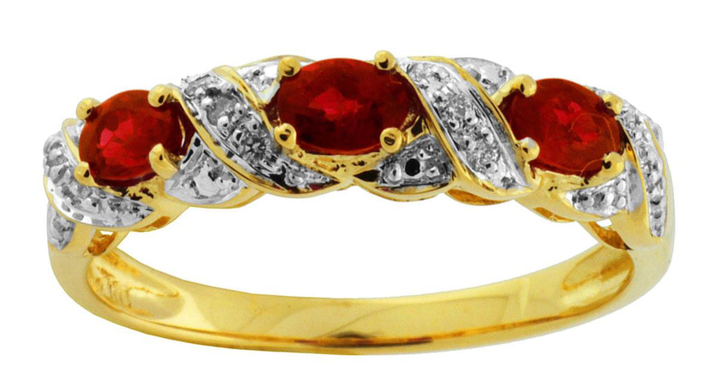 14KT YELLOW GOLD FUN RING. 3D X LOVE THREE STONE DESIGN. ROUND DIAMONDS ARE F/G COLOR, VSSI CLARITY .04 CARATS. AAA OVAL RUBIES ARE .68 CARATS. RING SIZE 7. CAN BE SIZED BY OUR MASTER JEWELER UPON REQUEST. WRITTEN APPRAISAL AVAILABLE. COMES IN A PRESENTABLE GIFT BOX.
