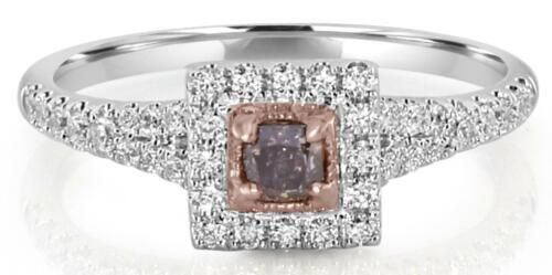 18KT WHITE AND ROSE GOLD FRIENDSHIP PROMISE RING. 3D SQUARE HALO DESIGN. ROUND WHITE DIAMONDS ARE F/G COLOR, VSSI C LARITY .32 CARATS. CUSHION CUT PINK DIAMOND IS .40 CARATS. RING SIZE 6.5. CAN BE SIZED BY OUR MASTER JEWELER UPON REQUEST. WRITTEN APPRAISAL AVAILABLE. COMES IN A PRESENTABLE GIFT BOX.