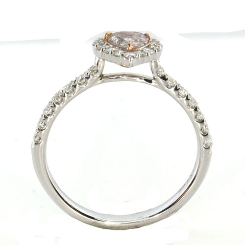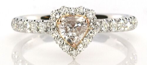 18KT WHITE AND ROSE GOLD ENGAGEMENT RING. 3D CLASSIC HALO DESIGN. ROUND WHITE DIAMONDS ARE F/G COLOR, VSSI CLARITY .39 CARATS. HEART SHAPE PINK DIAMOND IS .33 CARATS. RING SIZE 7. CAN BE SIZED BY OUR MASTER JEWELER UPON REQUEST. WRITTEN APPRAISAL AVAILABLE. COMES IN A PRESENTABLE GIFT BOX.