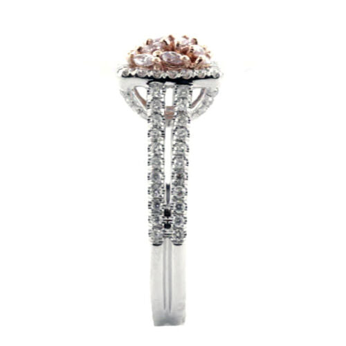 18KT WHITE AND ROSE GOLD FUN RING. 3D CLUSTER SQUARE DESIGN. ROUND WHITE DIAMONDS ARE F/G COLOR, VSSI CLARITY .42 CARATS. MARQUISE PINK DIAMONDS ARE .30 CARATS. RING SIZE 7. CAN BE SIZED BY OUR MASTER JEWELER UPON REQUEST. WRITTEN APPRAISAL AVAILABLE. COMES IN A PRESENTABLE GIFT BOX.