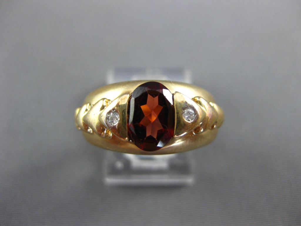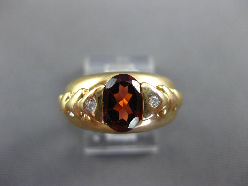 14KT YELLOW GOLD FUN RING. 3D ETOILE TRIANGULAR DESIGN. ROUND DIAMONDS ARE F/G COLOR, VSSI CLARITY .03 CARATS. AAA OVAL GARNET IS .70 CARATS. MEASURES 9.5mm WIDE. RING SIZE 6. CAN BE SIZED BY OUR MASTER JEWELER UPON REQUEST. WRITTEN APPRAISAL AVAILABLE. COMES IN A PRESENTABLE GIFT BOX.
