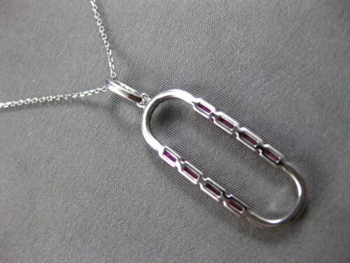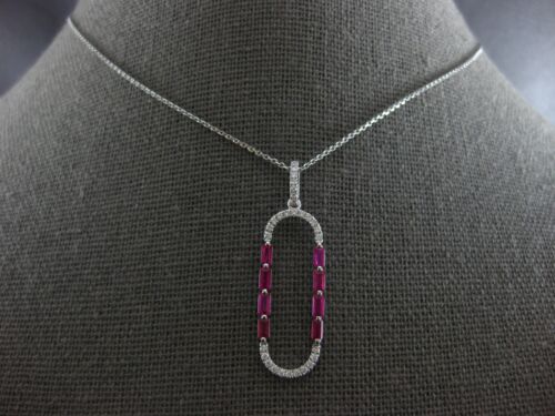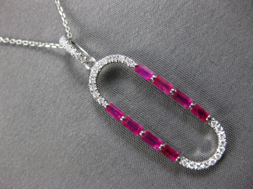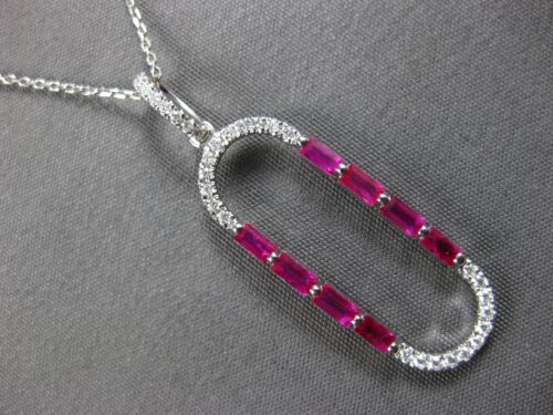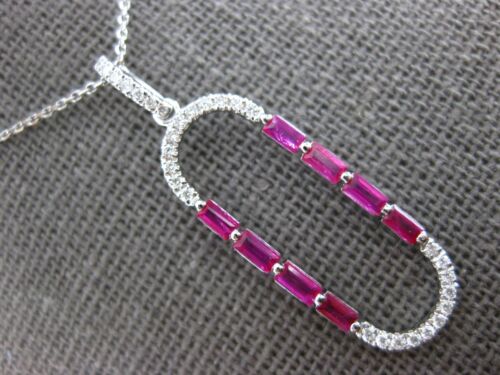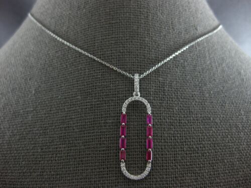 14KT WHITE GOLD FUN FLOATING PENDANT. 3D OPEN OVAL DESIGN. ROUND DIAMONDS ARE F/G COLOR, VSSI CLARITY .14 CARATS. AAA BAGUETTE RUBIES ARE .60 CARATS. MEASURES 33mm X 10mm. COMES ON A 14KT GOLD DIAMOND CUT 16" INCH CHAIN. WRITTEN APPRAISAL AVAILABLE. COMES IN A PRESENTABLE GIFT BOX.