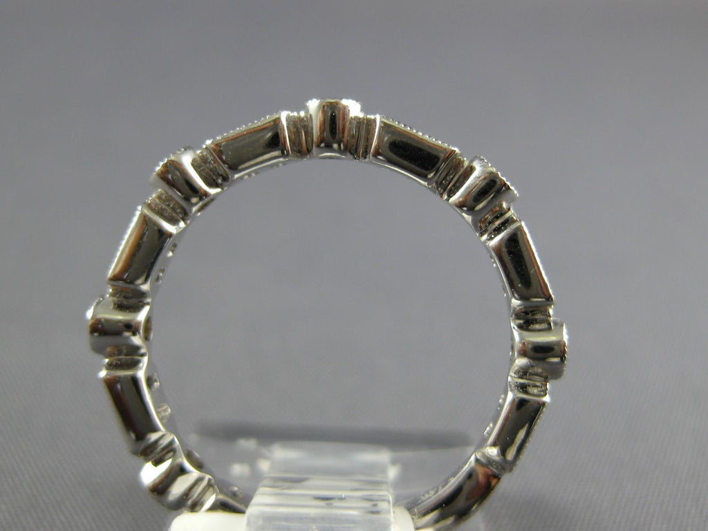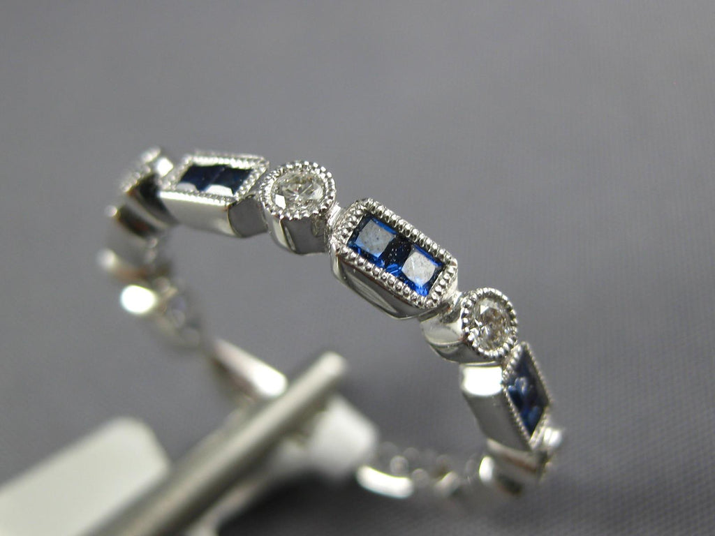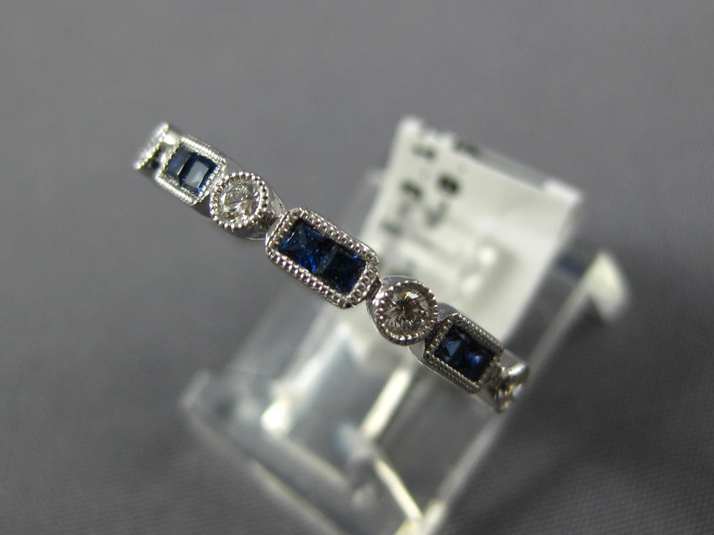 18KT WHITE GOLD ANNIVERSARY RING. 3D FILIGREE MILGRAIN THREE FOURTHS ETERNITY DESIGN. ROUND DIAMONDS ARE F/G COLOR, VSSI CLARITY .17 CARATS. AAA PRINCESS CUT SAPPHIRES ARE .57 CARATS. MEASURES 3mm WIDE. RING SIZE 6.25. CAN BE SIZED BY OUR MASTER JEWELER UPON REQUEST. WRITTEN APPRAISAL AVAILABLE. COMES IN A PRESENTABLE GIFT BOX.
