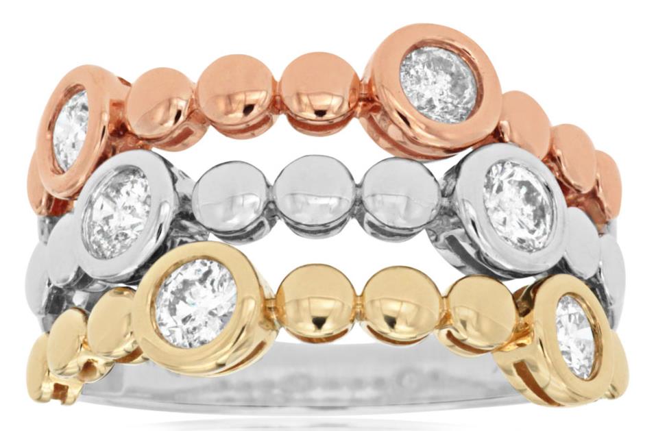 14KT WHITE, YELLOW, AND ROSE GOLD ANNIVERSARY RING. 3D BEZEL ATTACHED STACKABLE DESIGN. ROUND DIAMONDS ARE F/G COLOR, VSSI CLARITY .75 CARATS. RING SIZE 7. CAN BE SIZED BY OUR MASTER JEWELER UPON REQUEST. WRITTEN APPRAISAL AVAILABLE. COMES IN A PRESENTABLE GIFT BOX.