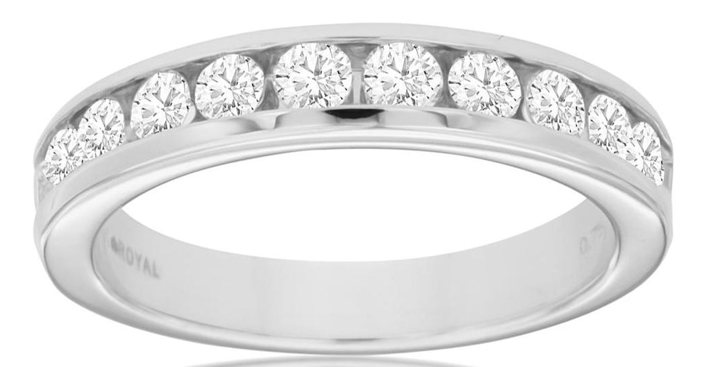 14KT WHITE GOLD WEDDING ANNIVERSARY RING. 3D CLASSIC CHANNEL SEMI ETERNITY DESIGN. ROUND DIAMONDS ARE F/G COLOR, VSSI CLARITY .75 CARATS. RING SIZE 7. CAN BE SIZED BY OUR MASTER JEWELER UPON REQUEST. WRITTEN APPRAISAL AVAILABLE. COMES IN A PRESENTABLE GIFT BOX.