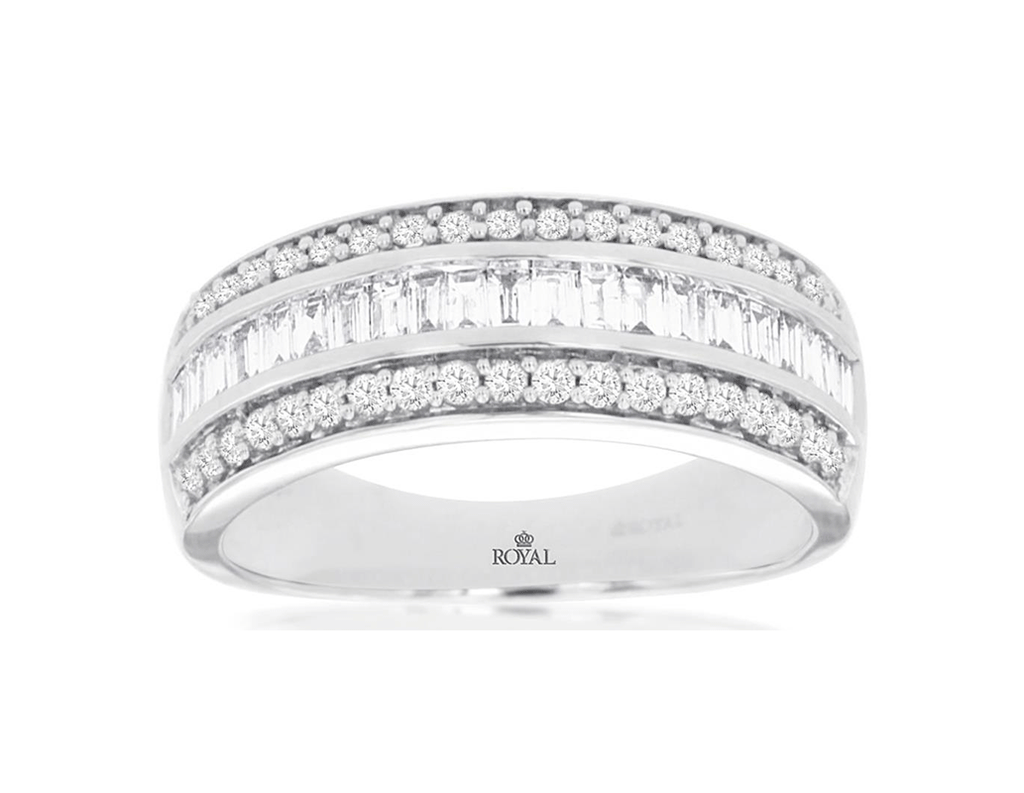 14KT WHITE GOLD WEDDING ANNIVERSARY RING. 3D CLASSIC SEMI ETERNITY THREE ROW DESIGN. ROUND AND BAGUETTE DIAMONDS ARE F/G COLOR, VSSI CLARITY .75 CARATS. RING SIZE 7. CAN BE SIZED BY OUR MASTER JEWELER UPON REQUEST. WRITTEN APPRAISAL AVAILABLE. COMES IN A PRESENTABLE GIFT BOX.