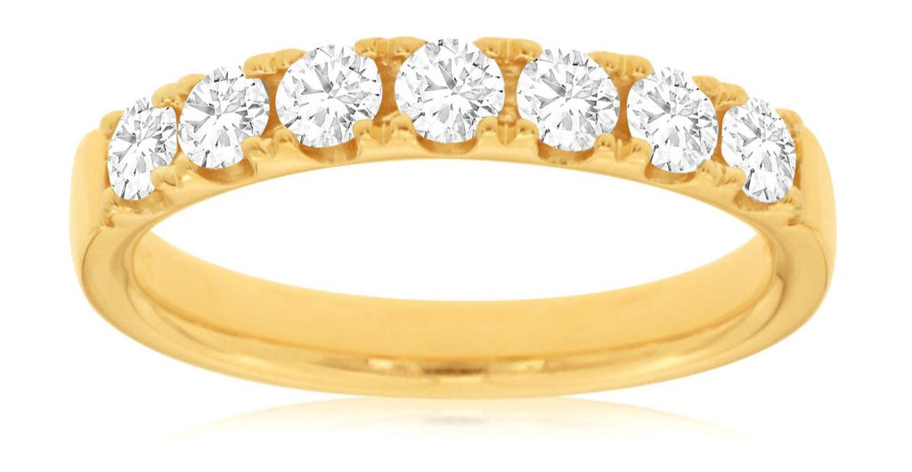 14KT YELLOW GOLD WEDDING ANNIVERSARY RING. 3D CLASSIC SEVEN STONE DESIGN. ROUND DIAMONDS ARE F/G COLOR, VSSI CLARITY .75 CARATS. RING SIZE 7. CAN BE SIZED BY OUR MASTER JEWELER UPON REQUEST. WRITTEN APPRAISAL AVAILABLE. COMES IN A PRESENTABLE GIFT BOX.