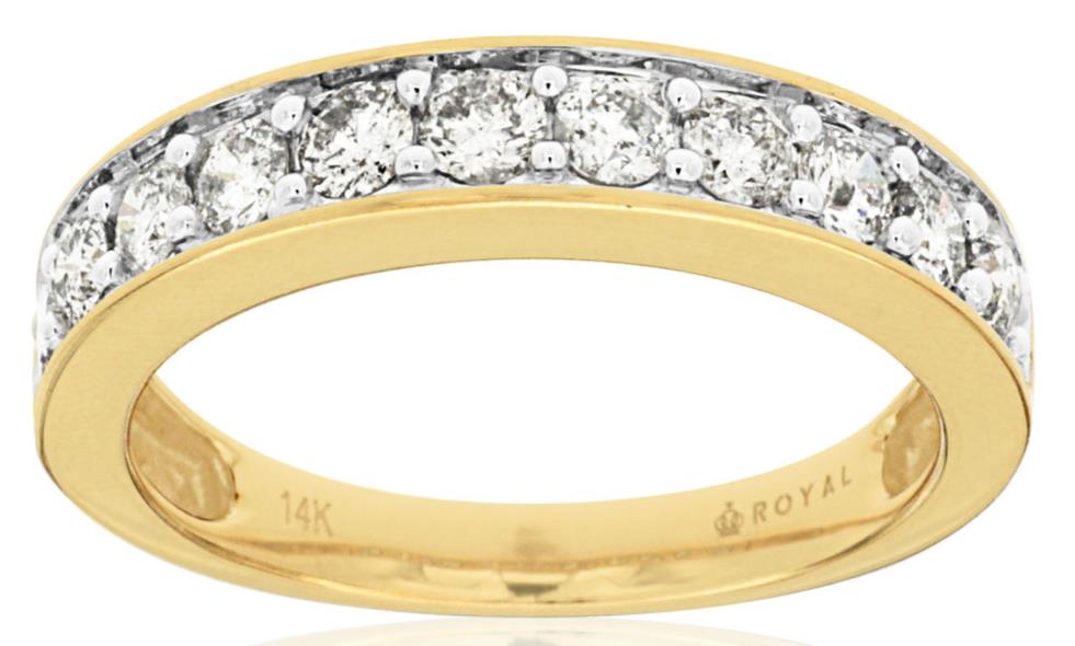 14KT YELLOW GOLD ANNIVERSARY RING. 3D CLASSIC CHANNEL SEMI ETERNITY DESIGN. ROUND DIAMONDS ARE F/G COLOR, VSSI CLARITY .75 CARATS. RING SIZE 7. CAN BE SIZED BY OUR MASTER JEWELER UPON REQUEST. WRITTEN APPRAISAL AVAILABLE. COMES IN A PRESENTABLE GIFT BOX.