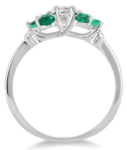 14KT WHITE GOLD LOVE RING. 3D SEVEN STONE FLORAL LUCIDA DESIGN. ROUND DIAMONDS ARE F/G COLOR, VSSI CLARITY .20 CARATS. AAA EMERALDS ARE .55 CARATS. RING SIZE 7. CAN BE SIZED BY OUR MASTER JEWELER UPON REQUEST. WRITTEN APPRAISAL AVAILABLE. COMES IN A PRESENTABLE GIFT BOX.