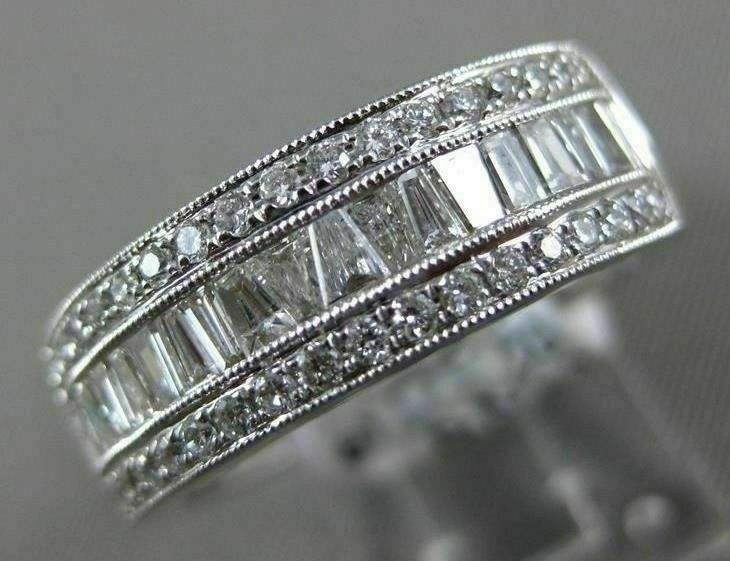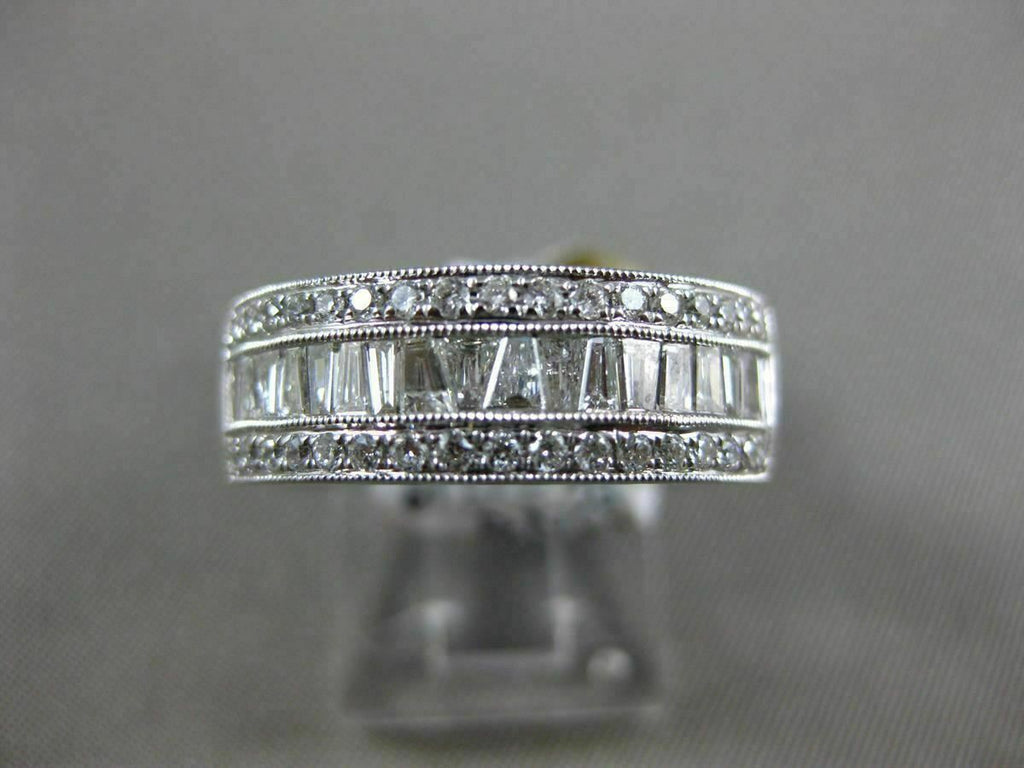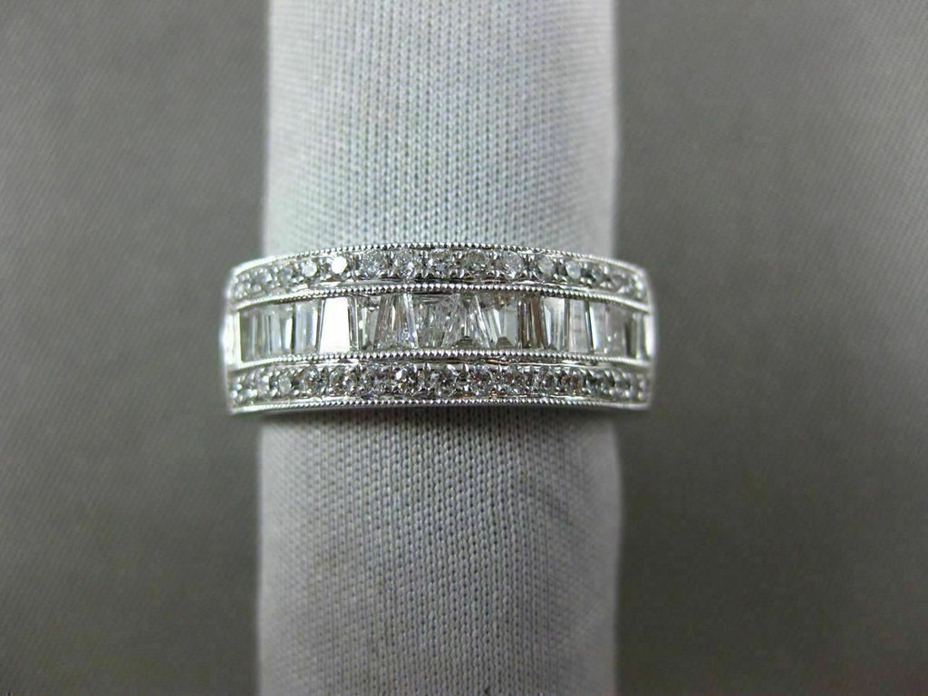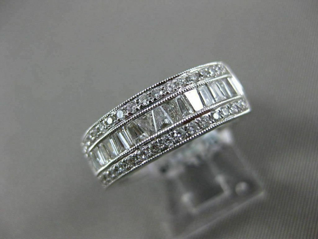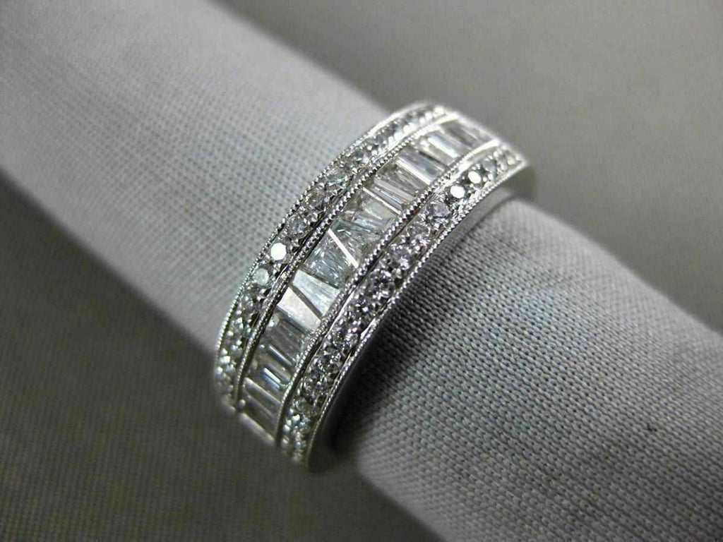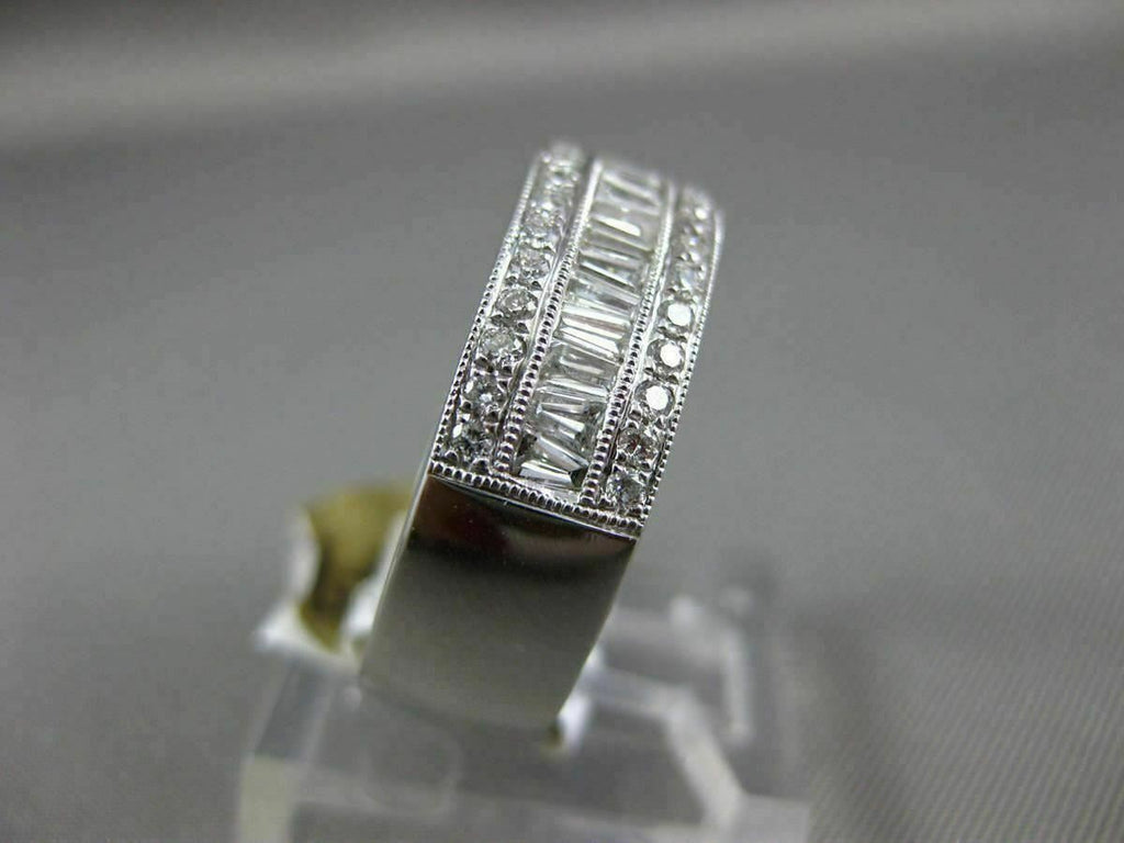 ESTATE WIDE 18KT WHITE GOLD WEDDING ANNIVERSARY RING. 3D SEMI ETERNITY DESIGN. ROUND & BAGUETTE DIAMONDS ARE F/G COLOR, VSSI CLARITY. ROUND DIAMONDS ARE .26 CARATS. BAGUETTE DIAMONDS ARE .49 CARATS. RING SIZE 7. CAN BE SIZED BY OUR MASTER JEWELER UPON REQUEST. WRITTEN APPRAISAL AVAILABLE. COMES IN A PRESENTABLE GIFT BOX
