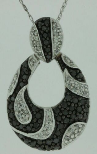 14KT WHITE GOLD FUN PENDANT. 3D TEAR DROP FILIGREE MILGRAIN DESIGN. WHITE DIAMONDS ARE F/G COLOR, VSSI CLARITY .25 CARATS. BLACK DIAMONDS ARE .50 CARATS. COMES ON A 14KT GOLD DIAMOND CUT 16" INCH CHAIN. WRITTEN APPRAISAL AVAILABLE. COMES IN A PRESENTABLE GIFT BOX.