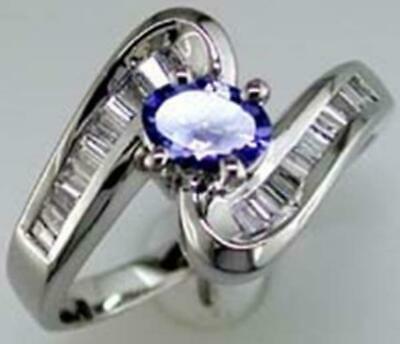14KT WHITE GOLD ENGAGEMENT RING. 3D CRISS CROSS DESIGN. BAGUETTE DIAMONDS ARE F/G COLOR, VSSI CLARITY .36 CARATS. AAA OVAL TANZANITE IS .40 CARATS. RING SIZE 7. CAN BE SIZED BY OUR MASTER JEWELER UPON REQUEST. WRITTEN APPRAISAL AVAILABLE. COMES IN A PRESENTABLE GIFT BOX.