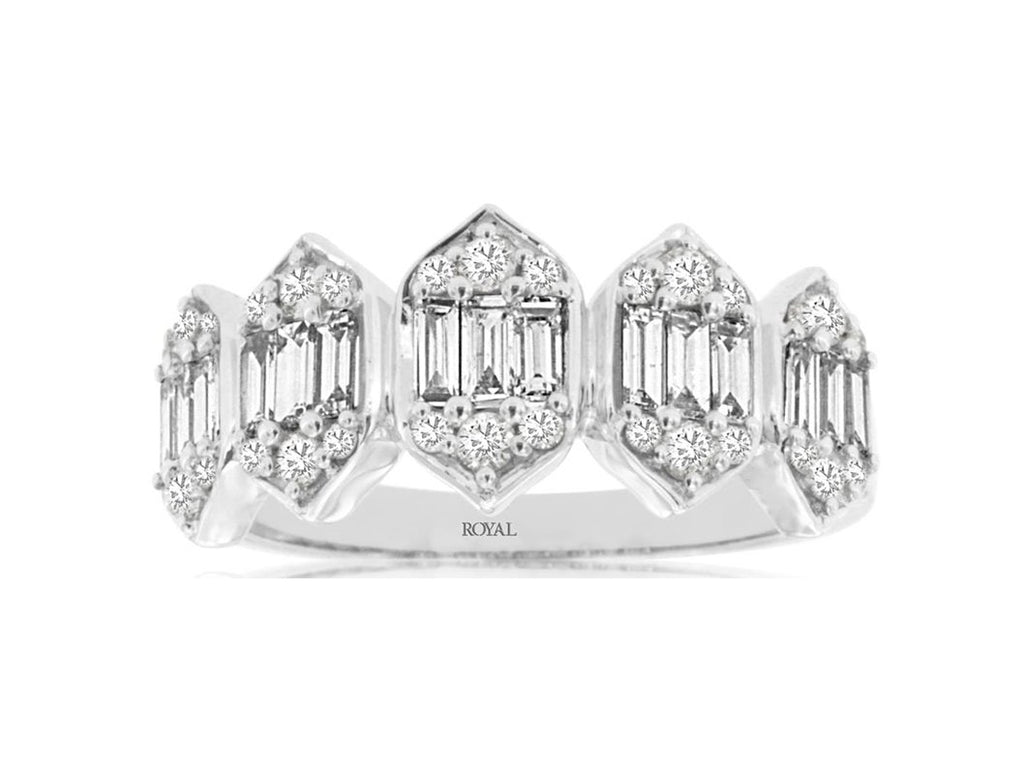 14KT WHITE GOLD FUN RING. 3D CLUSTER MULTI HEXAGON DESIGN. ROUND AND BAGUETTE DIAMONDS ARE F/G COLOR, VSSI CLARITY .77 CARATS. RING SIZE 7. CAN BE SIZED BY OUR MASTER JEWELER UPON REQUEST. WRITTEN APPRAISAL AVAILABLE. COMES IN A PRESENTABLE GIFT BOX.