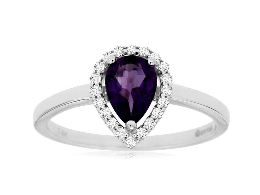 14KT WHITE GOLD LOVE RING. 3D CLASSIC HALO DESIGN. ROUND DIAMONDS ARE F/G COLOR, VSSI CLARITY .12 CARATS. AAA EXTRA FACETED PEAR SHAPE AMETHYST IS .65 CARATS. RING SIZE 7. CAN BE SIZED BY OUR MASTER JEWELER UPON REQUEST. WRITTEN APPRAISAL AVAILABLE. COMES IN A PRESENTABLE GIFT BOX.