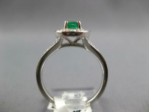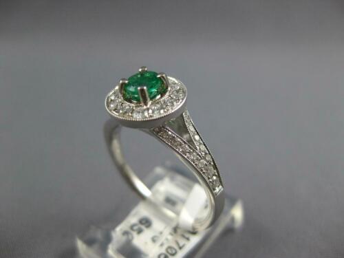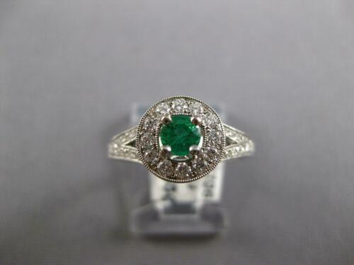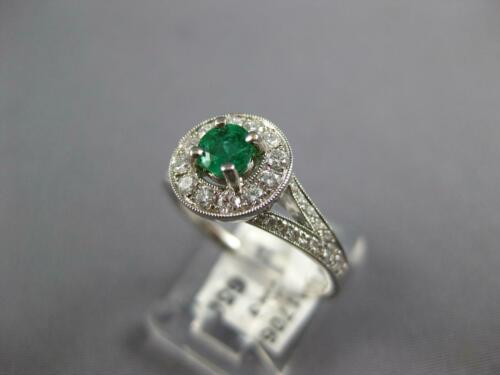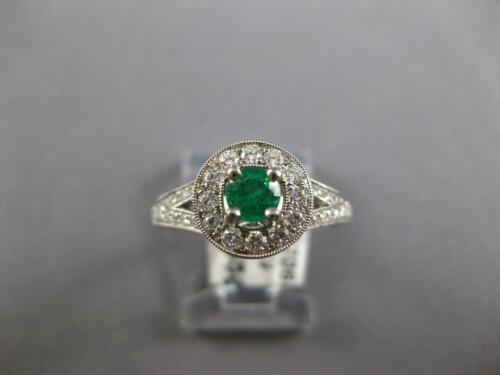 18KT WHITE GOLD FUN RING. 3D HALO FILIGREE MILGRAIN FLOWER DESIGN. ROUND DIAMONDS ARE F/G COLOR, VSSI CLARITY .47 CARATS. AAA ROUND EMERALD IS .30 CARATS. MEASURES 9.5mm WIDE. RING SIZE 6.5. CAN BE SIZED BY OUR MASTER JEWELER UPON REQUEST. WRITTEN APPRAISAL AVAILABLE. COMES IN A PRESENTABLE GIFT BOX.