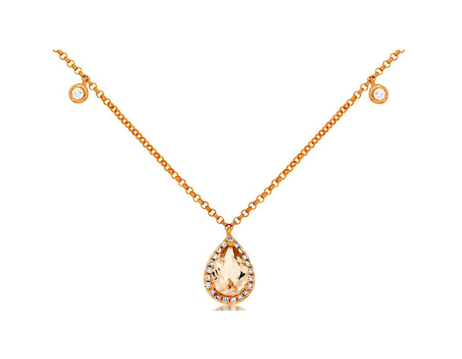 .77CT DIAMOND & AAA MORGANITE 14KT ROSE GOLD 3D PEAR SHAPE & ROUND HALO NECKLACE