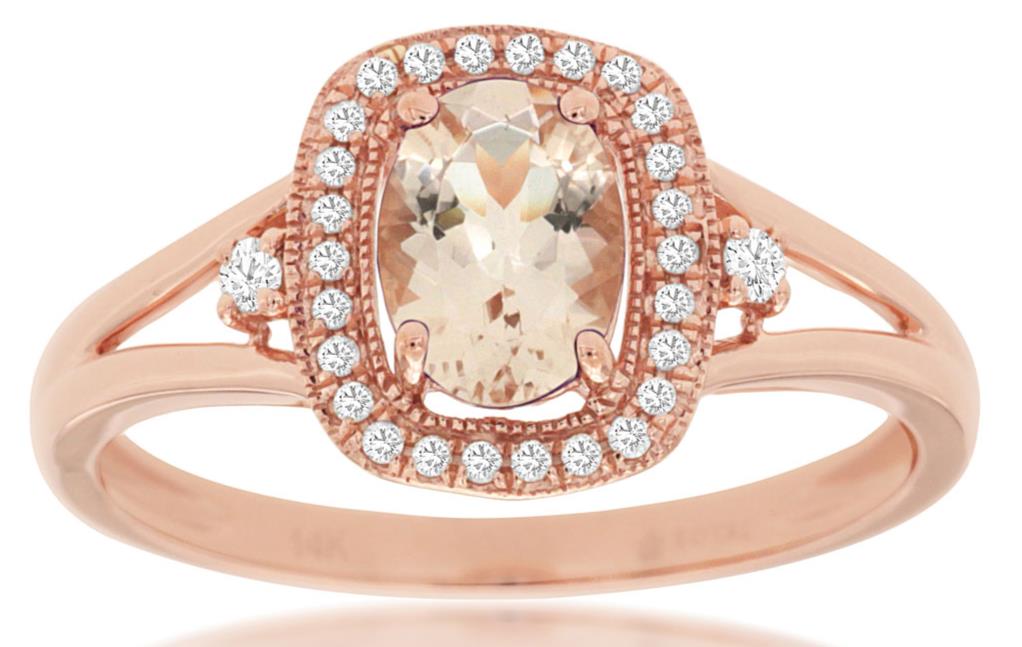 14KT ROSE GOLD ENGAGEMENT RING. 3D SQUARE HALO FILIGREE DESIGN. ROUND DIAMONDS ARE F/G COLOR, VSSI CLARITY .10 CARATS. AAA EXTRA FACETED OVAL MORGANITE IS .67 CARATS. RING SIZE 7. CAN BE SIZED BY OUR MASTER JEWELER UPON REQUEST. WRITTEN APPRAISAL AVAILABLE. COMES IN A PRESENTABLE GIFT BOX.