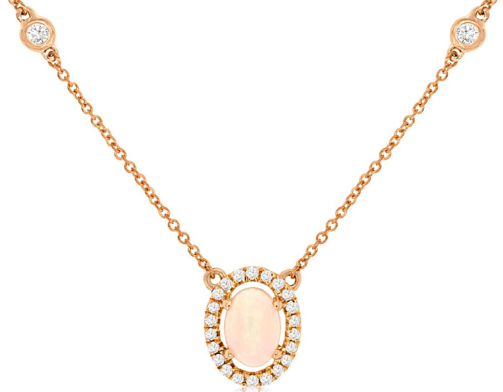 14KT ROSE GOLD LOVE NECKLACE. 3D BY THE YARD CLASSIC HALO DESIGN. ROUND DIAMONDS ARE F/G COLOR, VSSI CLARITY .27 CARATS. AAA OVAL OPAL IS .50 CARATS. 17" INCHES LONG. WRITTEN APPRAISAL AVAILABLE. COMES IN A PRESENTABLE GIFT BOX.