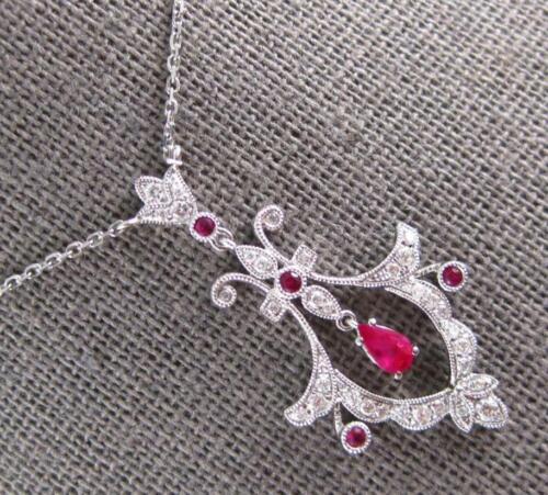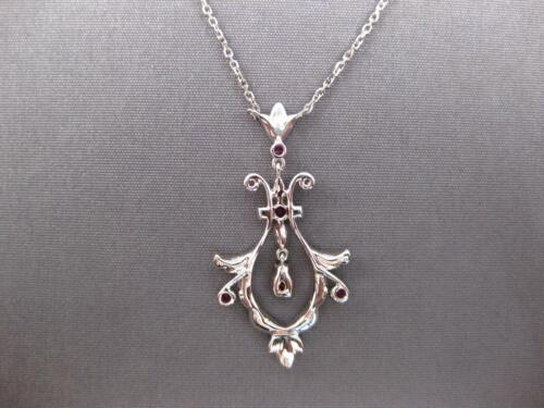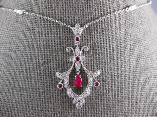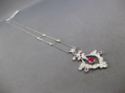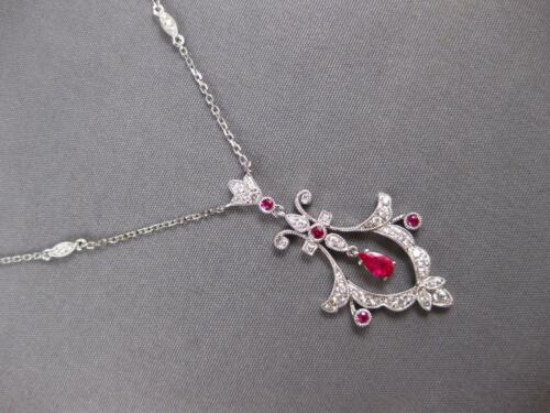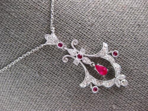 18KT WHITE GOLD LOVE NECKLACE. 3D FLOWER FILIGREE MILGRAIN BY THE YARD DESIGN. DIAMONDS ARE F/G COLOR, VSSI CLARITY .25 CARATS. AAA RUBIES ARE .52 CARATS. MEASURES 32mm x 17mm. 16-18" INCHES LONG. WRITTEN APPRAISAL AVAILABLE. COMES IN A PRESENTABLE GIFT BOX.