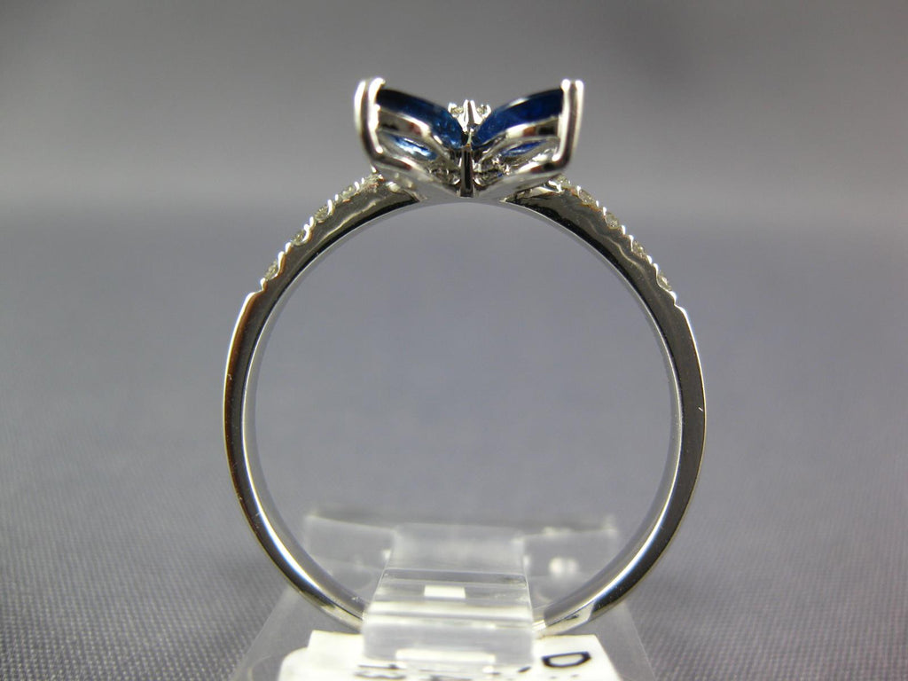 14KT WHITE GOLD LOVE RING. 3D FOUR LEAF CLOVER FLOWER DESIGN. ROUND DIAMONDS ARE F/G COLOR, VSSI CLARITY .12 CARATS. AAA MARQUISE SAPPHIRES ARE .65 CARATS. MEASURES 8.5mm WIDE. RING SIZE 6.5. CAN BE SIZED BY OUR MASTER JEWELER UPON REQUEST. WRITTEN APPRAISAL AVAILABLE. COMES IN A PRESENTABLE GIFT BOX.