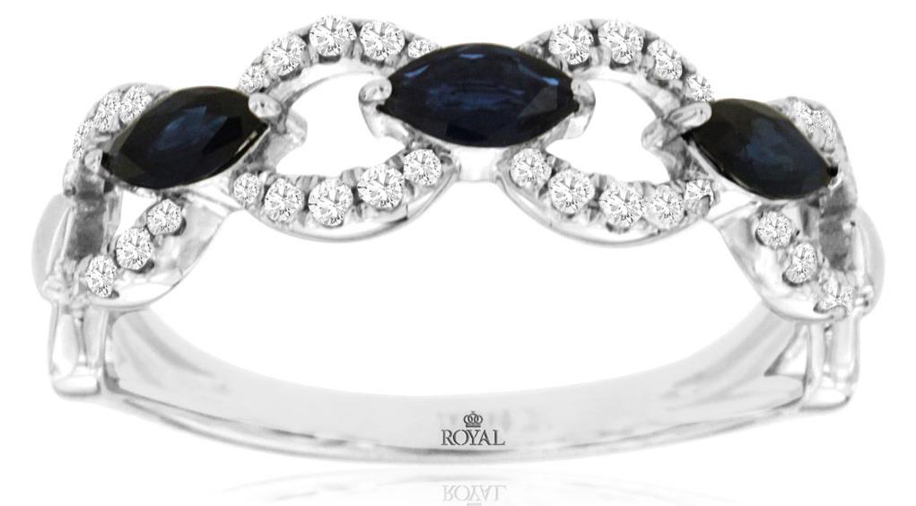 14KT WHITE GOLD FUN RING. 3D LOVE KNOT DESIGN. ROUND DIAMONDS ARE F/G COLOR, VSSI CLARITY .20 CARATS. AAA MARQUISE SAPPHIRES ARE .57 CARATS. RING SIZE 7. CAN BE SIZED BY OUR MASTER JEWELER UPON REQUEST. WRITTEN APPRAISAL AVAILABLE. COMES IN A PRESENTABLE GIFT BOX.