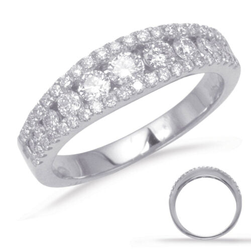 14KT WHITE GOLD ANNIVERSARY RING. 3D THREE ROW GRADUATING SEMI ETERNITY DESIGN. ROUND DIAMONDS ARE F/G COLOR, VSSI CLARITY .78 CARATS. MEASURES 6mm WIDE. RING SIZE 6.5. CAN BE SIZED BY OUR MASTER JEWELER UPON REQUEST. WRITTEN APPRAISAL AVAILABLE. COMES IN A PRESENTABLE GIFT BOX.