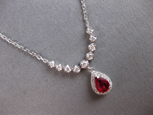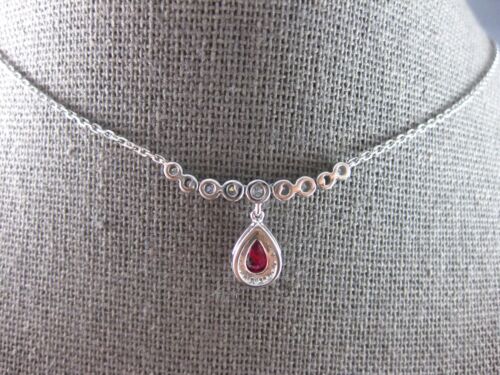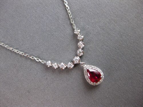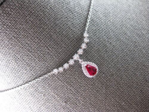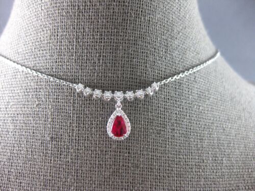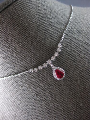 14KT WHITE GOLD LOVE NECKLACE. 3D HALO TEAR DROP DESIGN. ROUND DIAMONDS ARE F/G COLOR, VSSI CLARITY .28 CARATS. AAA PEAR SHAPE RUBY IS .50 CARATS. MEASURES 9mm X 6mm. 16-18" INCHES LONG. WRITTEN APPRAISAL AVAILABLE. COMES IN A PRESENTABLE GIFT BOX.