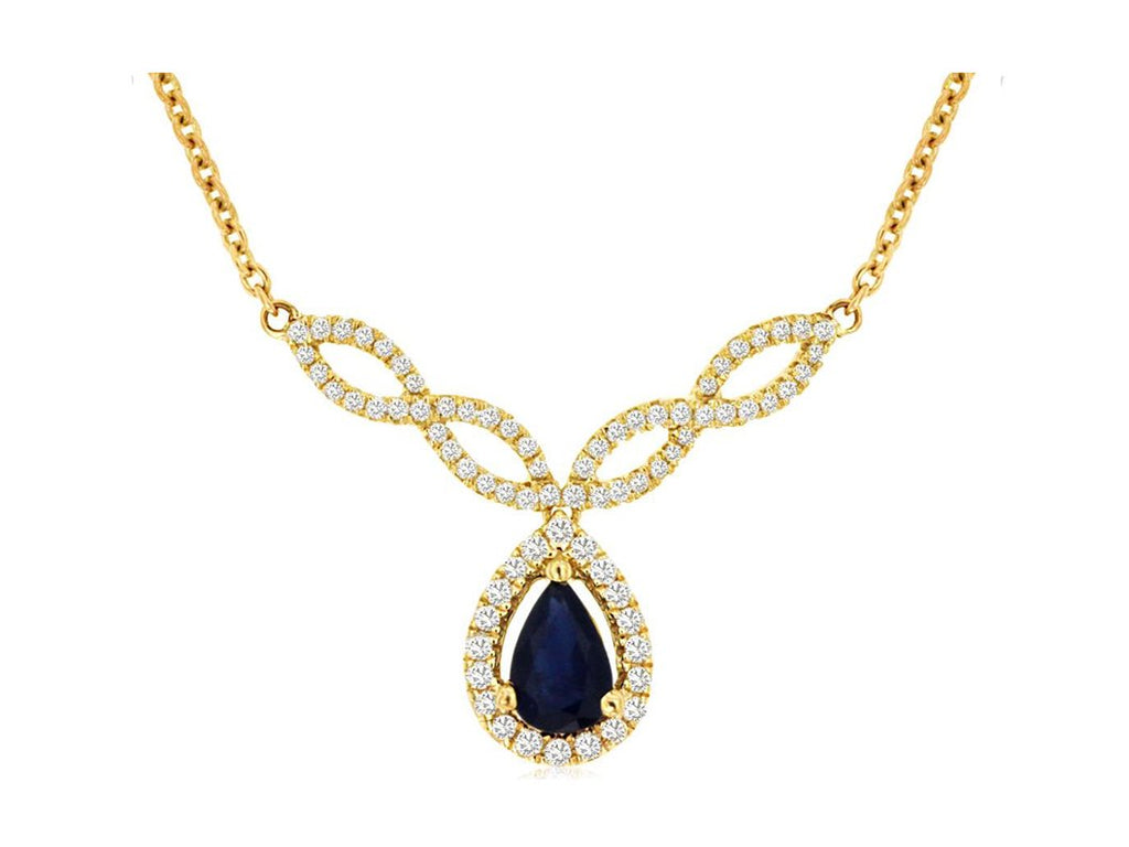 14KT YELLOW GOLD LOVE NECKLACE. 3D DOUBLE INFINITY TEAR DROP DESIGN. ROUND DIAMONDS ARE F/G COLOR, VSSI CLARITY .25 CARATS. AAA PEAR SHAPE SAPPHIRES ARE .53 CARATS. 17" INCHES LONG. WRITTEN APPRAISAL AVAILABLE. COMES IN A PRESENTABLE GIFT BOX.