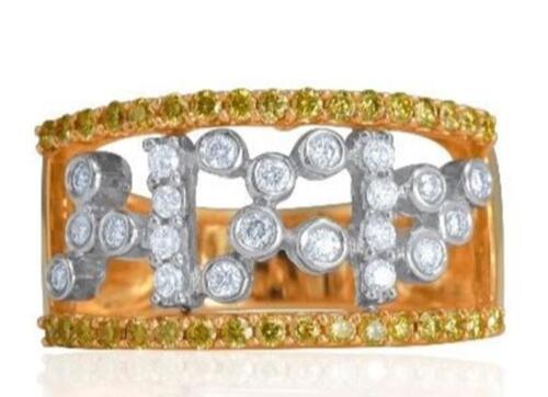 14KT WHITE AND YELLOW GOLD FUN ANNIVERSARY RING. 3D CLUSTER ETOILE DESIGN. WHITE DIAMONDS ARE F/G COLOR, VSSI CLARITY .33 CARATS. FANCY YELLOW DIAMONDS ARE .45 CARATS. RING SIZE 7. CAN BE SIZED BY OUR MASTER JEWELER UPON REQUEST. WRITTEN APPRAISAL AVAILABLE. COMES IN A PRESENTABLE GIFT BOX.