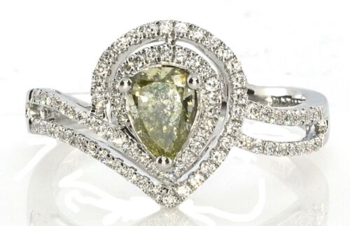 18KT WHITE GOLD FUN ENGAGEMENT RING. 3D DOUBLE HALO SWIRL DESIGN. ROUND WHITE DIAMONDS ARE F/G COLOR, VSSI CLARITY .30 CARATS. FANCY YELLOW PEAR SHAPE DIAMOND IS .48 CARATS. RING SIZE 6.5. CAN BE SIZED BY OUR MASTER JEWELER UPON REQUEST. WRITTEN APPRAISAL AVAILABLE. COMES IN A PRESENTABLE GIFT BOX.