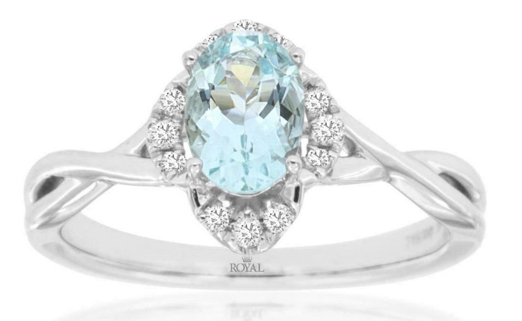 14KT WHITE GOLD LOVE RING. 3D INFINITY DESIGN. ROUND DIAMONDS ARE F/G COLOR, VSSI CLARITY .11 CARATS. AAA OVAL AQUAMARINE IS .68 CARATS. RING SIZE 7. CAN BE SIZED BY OUR MASTER JEWELER UPON REQUEST. WRITTEN APPRAISAL AVAILABLE. COMES IN A PRESENTABLE GIFT BOX.