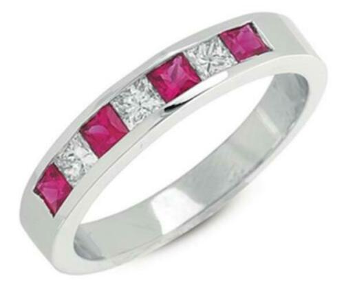14KT WHITE GOLD FUN RING. 3D CLASSIC CHANNEL DESIGN. PRINCESS CUT DIAMONDS ARE F/G COLOR, VSSI CLARITY .30 CARATS. AAA PRINCESS CUT RUBIES ARE .49 CARATS. RING SIZE 6.5. CAN BE SIZED BY OUR MASTER JEWELER UPON REQUEST. WRITTEN APPRAISAL AVAILABLE. COMES IN A PRESENTABLE GIFT BOX.