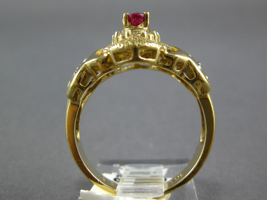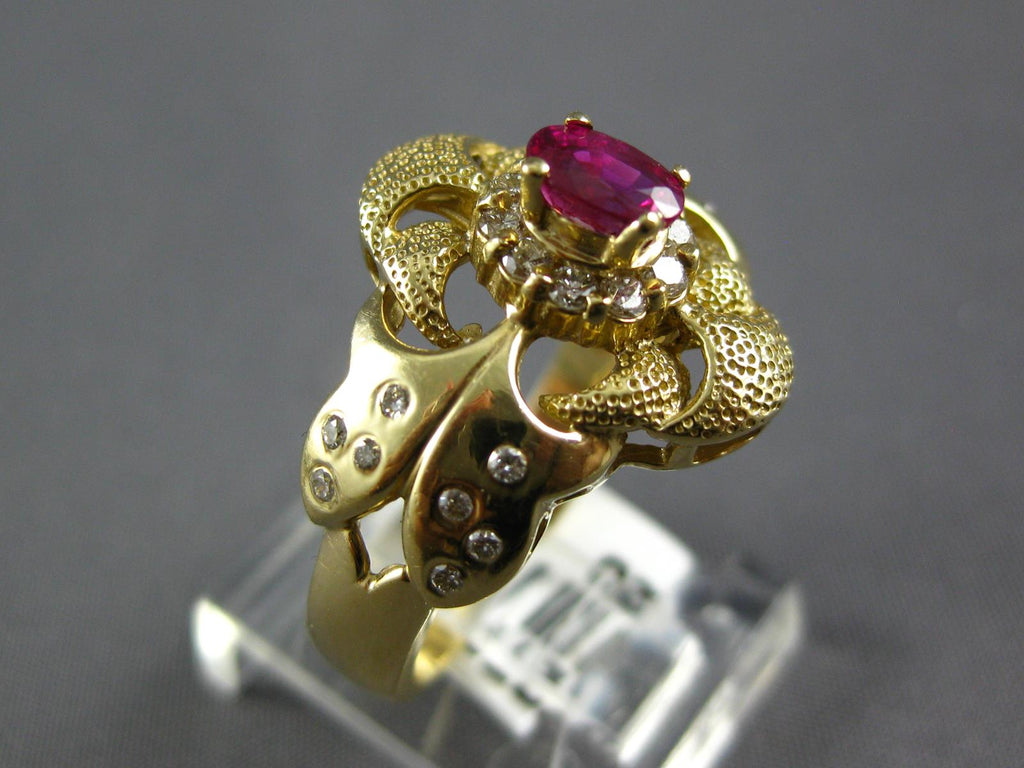 14KT YELLOW GOLD FUN RING. 3D FLOWER FILIGREE DESIGN. ROUND DIAMONDS ARE F/G COLOR, VSSI CLARITY .32 CARATS. AAA OVAL RUBY IS .47 CARATS. MEASURES 15.5mm WIDE. RING SIZE 7.75. CAN BE SIZED BY OUR MASTER JEWELER UPON REQUEST. WRITTEN APPRAISAL AVAILABLE. COMES IN A PRESENTABLE GIFT BOX.