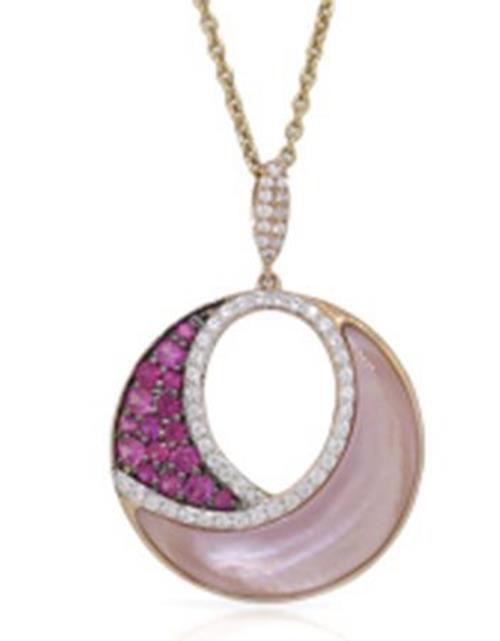 .57CT DIAMOND AAA RUBY & MOTHER OF PEARL 14KT ROSE GOLD 3D CIRCULAR FUN PENDANT
