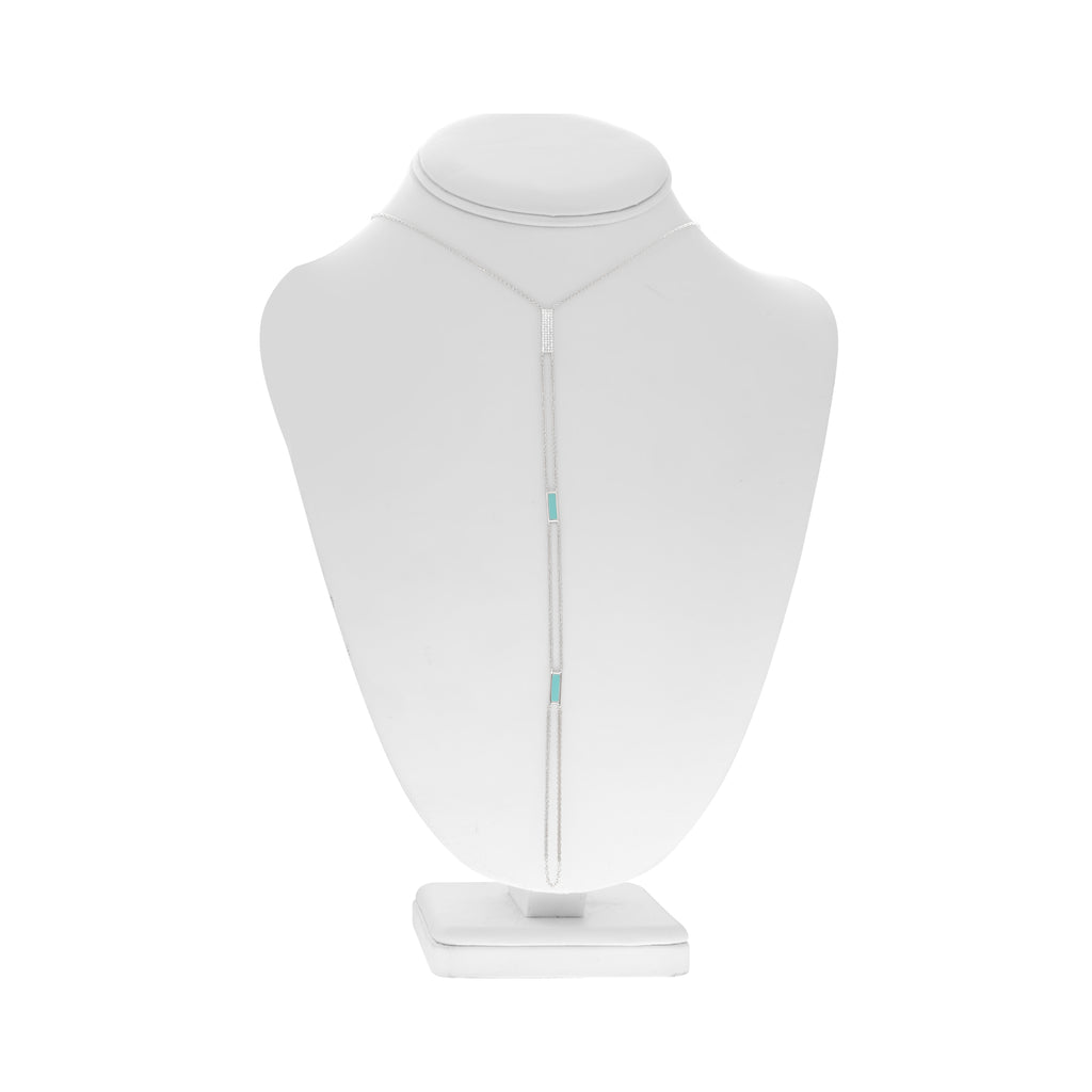14KT WHITE GOLD FUN NECKLACE. 3D CLUSTER RECTANGULAR LARIAT DESIGN. DIAMONDS ARE F/G COLOR, VSSI CLARITY 0.13 CARATS. AAA TURQUOISE ARE 0.54 CARATS. MEASURES 15mm X 4mm. 17.5" INCHES LONG. WRITTEN APPRAISAL AVAILABLE. COMES IN A PRESENTABLE GIFT BOX.