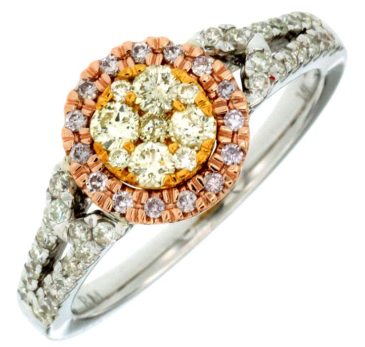 .7CT WHITE PINK & FANCY YELLOW DIAMOND 14K TRI COLOR GOLD FLOWER FRIENDSHIP RING