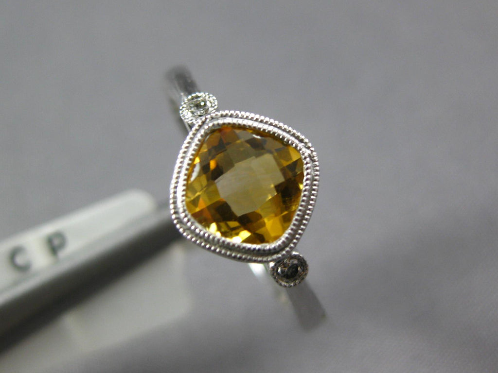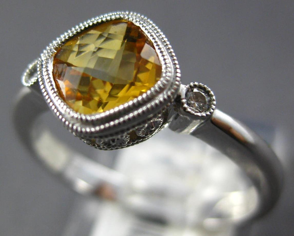 14KT WHITE GOLD FUN RING. 3D THREE STONE BEZEL DESIGN. ROUND DIAMONDS ARE F/G COLOR, VSSI CLARITY .06 CARATS. AAA CUSHION CUT CITRINE IS .74 CARATS. MEASURES 8mm WIDE. RING SIZE 6.5. CAN BE SIZED BY OUR MASTER JEWELER UPON REQUEST. WRITTEN APPRAISAL AVAILABLE. COMES IN A PRESENTABLE GIFT BOX.