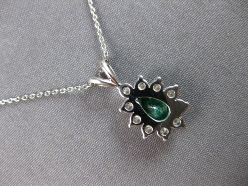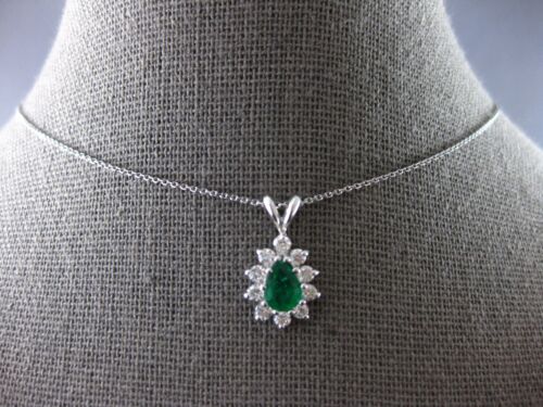 14KT WHITE GOLD FLOATING PENDANT. 3D CLASSIC TEAR DROP DESIGN. ROUND DIAMONDS ARE F/G COLOR, VVS-VS CLARITY .30 CARATS. AAA PEAR SHAPE EMERALD IS .50 CARATS. MEASURES 18mm X 10mm. COMES ON A 14KT GOLD DIAMOND CUT 16" INCH CHAIN. WRITTEN APPRAISAL AVAILABLE. COMES IN A PRESENTABLE GIFT BOX.