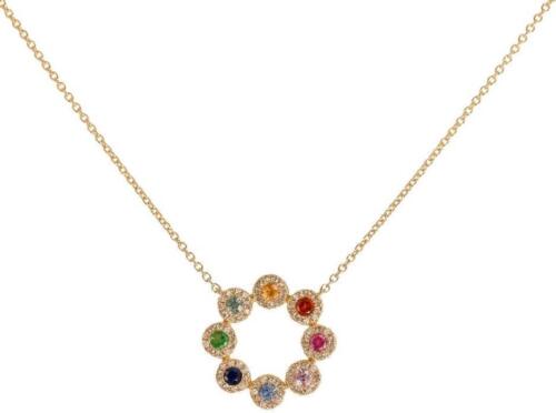 14KT YELLOW GOLD LOVE NECKLACE. 3D MULTI FLOWER CIRCLE OF LIFE DESIGN. DIAMONDS ARE F/G COLOR, VSSI CLARITY .37 CARATS. AAA MULTI COLOR SAPPHIRES ARE .43 CARATS. 17" INCHES LONG. WRITTEN APPRAISAL AVAILABLE. COMES IN A PRESENTABLE GIFT BOX.