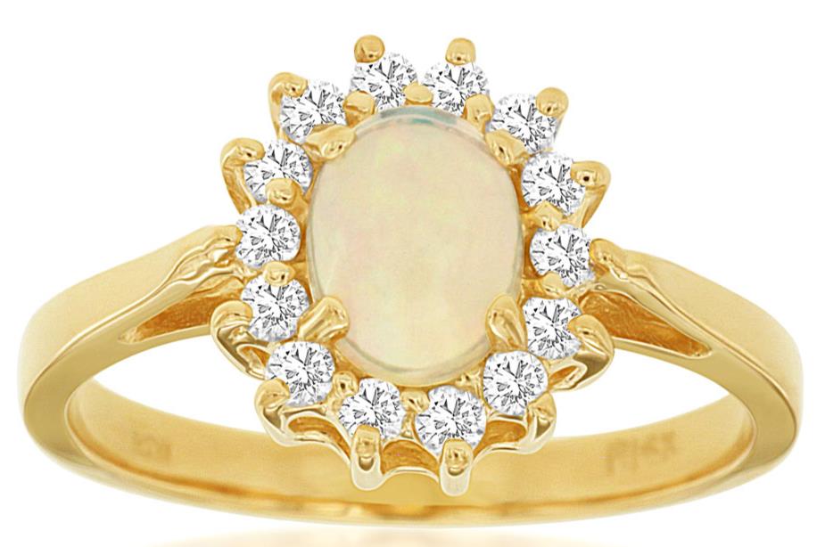 14KT YELLOW GOLD LOVE RING. 3D CLASSIC FLOWER DESIGN. ROUND DIAMONDS ARE F/G COLOR, VSSI CLARITY .30 CARATS. AAA OVAL OPAL IS .50 CARATS. RING SIZE 7. CAN BE SIZED BY OUR MASTER JEWELER UPON REQUEST. WRITTEN APPRAISAL AVAILABLE. COMES IN A PRESENTABLE GIFT BOX.