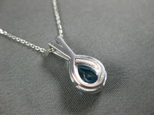 14KT WHITE GOLD FLOATING PENDANT. 3D CLASSIC HALO TEAR DROP DESIGN. ROUND DIAMONDS ARE F/G COLOR, VSSI CLARITY .11 CARATS. AAA EXTRA FACETED PEAR SHAPE BLUE TOPAZ IS .70 CARATS. MEASURES 15mm X 7mm. COMES ON A 14KT GOLD DIAMOND CUT 16" INCH CHAIN. WRITTEN APPRAISAL AVAILABLE. COMES IN A PRESENTABLE GIFT BOX.