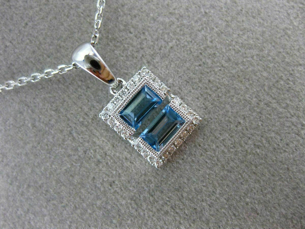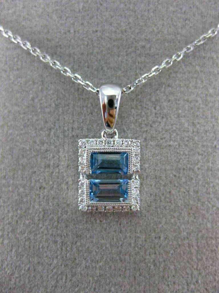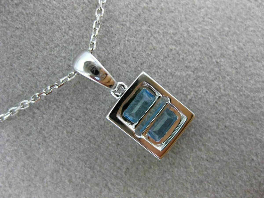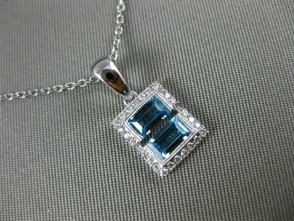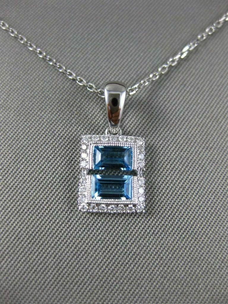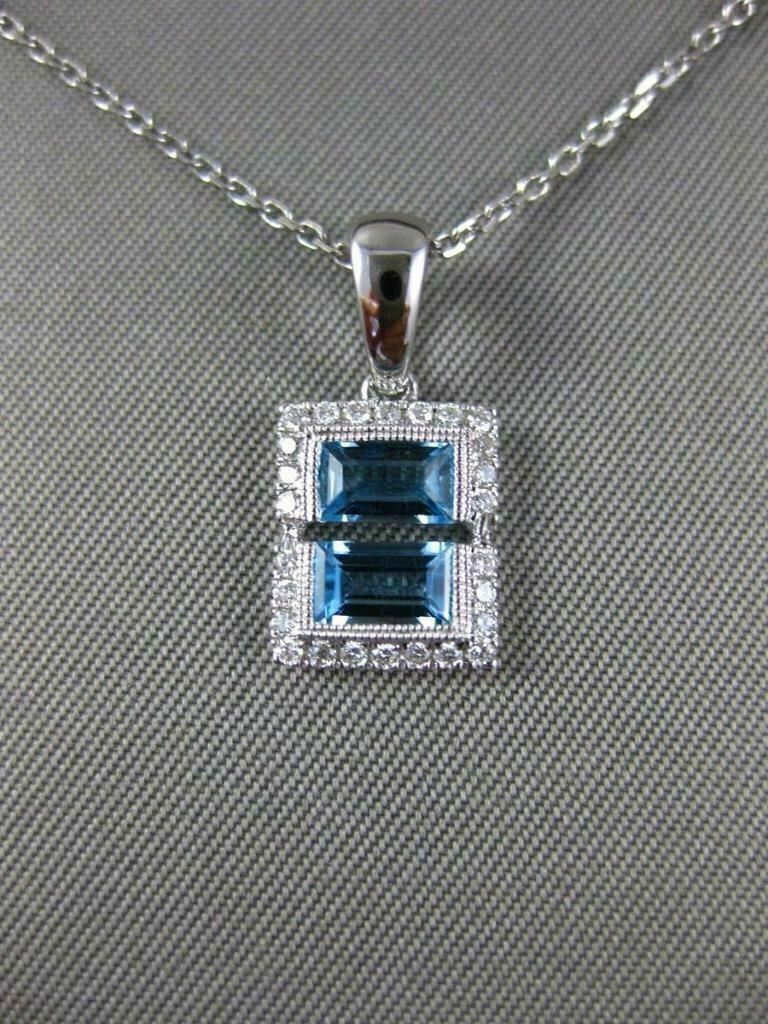 14KT WHITE GOLD LOVE PENDANT. 3D RECTANGULAR ILLUSION DESIGN. DIAMONDS ARE F/G COLOR, VSSI CLARITY .13 CARATS. AAA EXTRA FACET BLUE TOPAZ IS .68 CARATS. MEASURES 17mm X 8mm WIDE. COMES ON A 14KT GOLD DIAMOND CUT 16" INCH CHAIN. WRITTEN APPRAISAL AVAILABLE. COMES IN A PRESENTABLE GIFT BOX