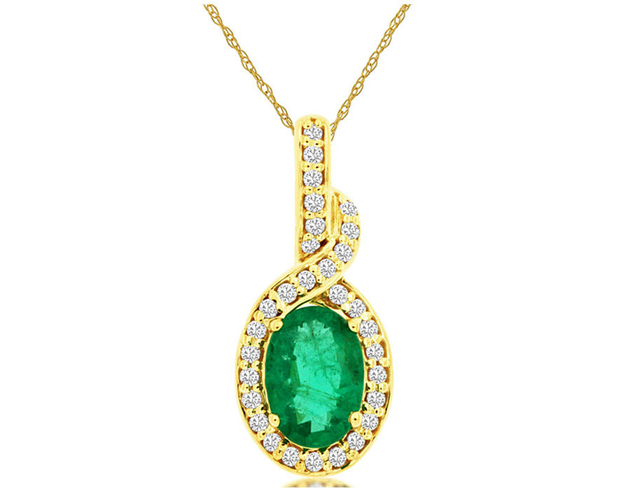 14KT YELLOW GOLD FLOATING PENDANT. 3D HALO LOVE KNOT DESIGN. ROUND DIAMONDS ARE F/G COLOR, VSSI CLARITY .12 CARATS. AAA OVAL EMERALD IS .70 CARATS. COMES ON A 14KT GOLD DIAMOND CUT 18" INCH CHAIN. WRITTEN APPRAISAL AVAILABLE. COMES IN A PRESENTABLE GIFT BOX.